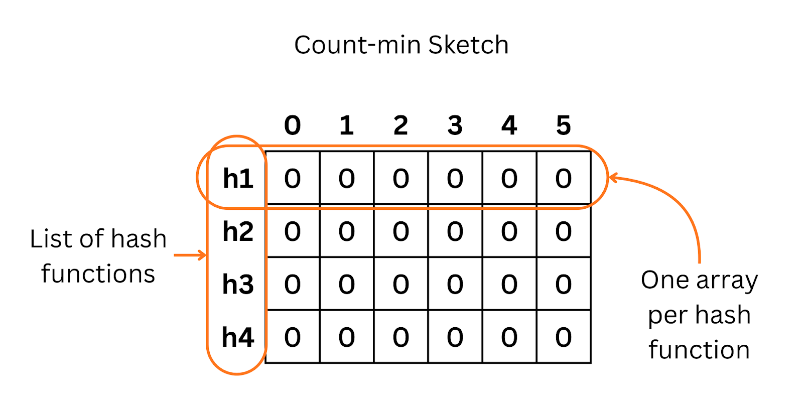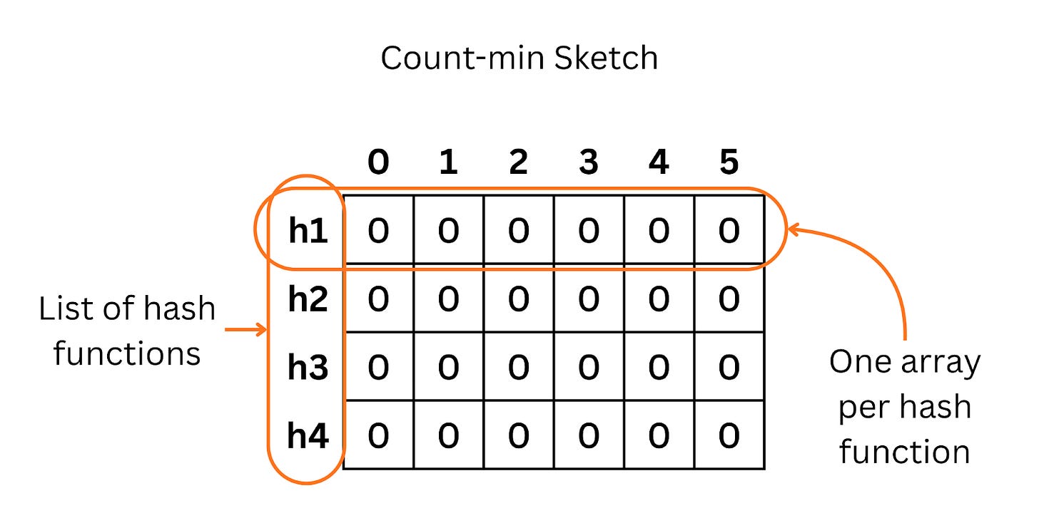Think of this as a 2D grid of counters, a matrix. When an event comes in, we hash it to map it to a specific cell in each row and increment those counters.