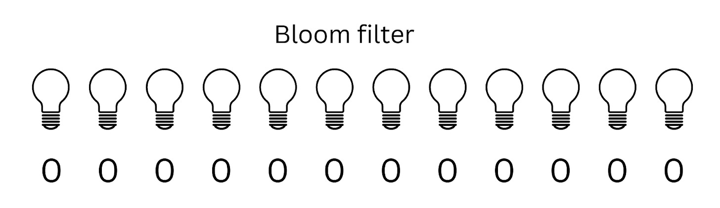 A Bloom Filter is like a row of light switches (bits), initially all set to ‘off’ (0).