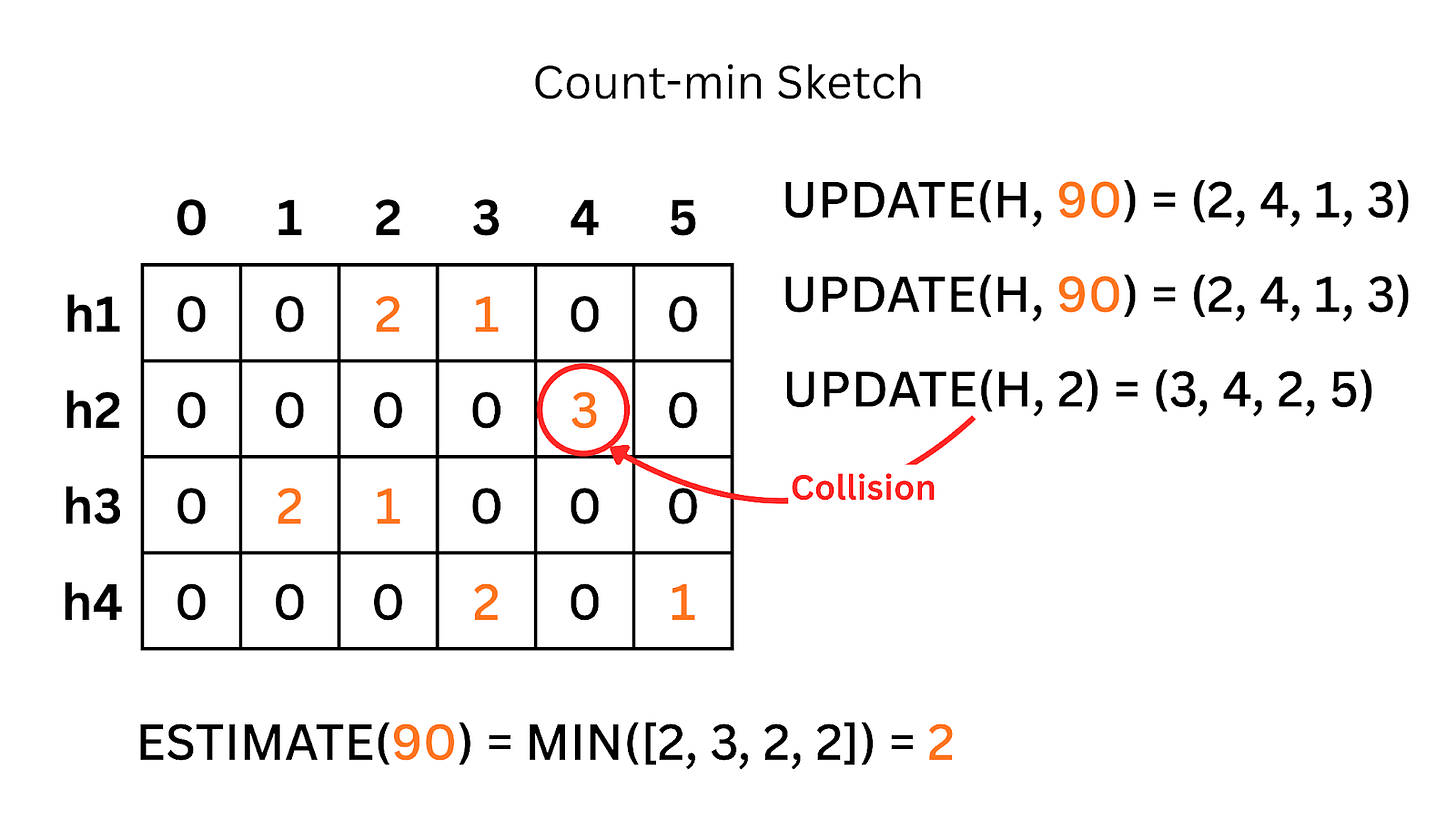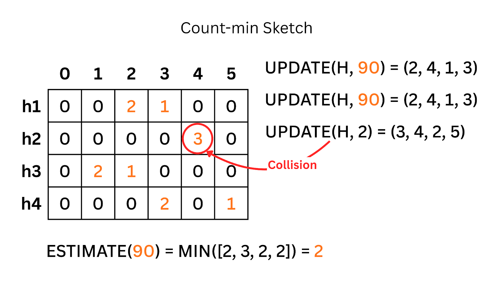 Because of collisions (different items mapping to the same cell), the count might be slightly higher than reality (overestimation). But it will never be lower. It lets us track trends in massive streams with constant space.
