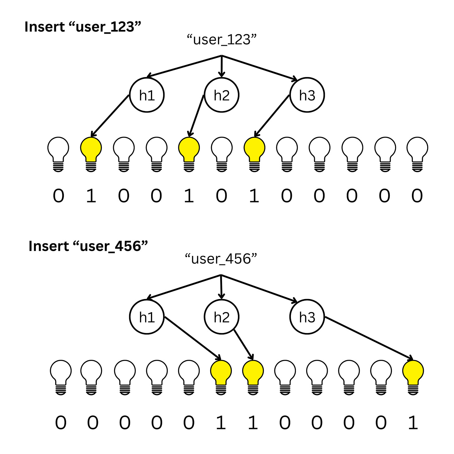 When a new item comes in, you run it through a few hash functions, each pointing to a position in the array. These functions tell you which switches to flip ‘on’ (1).