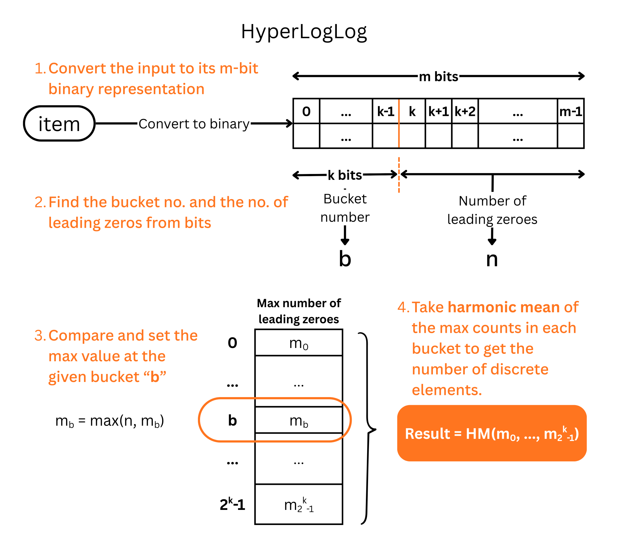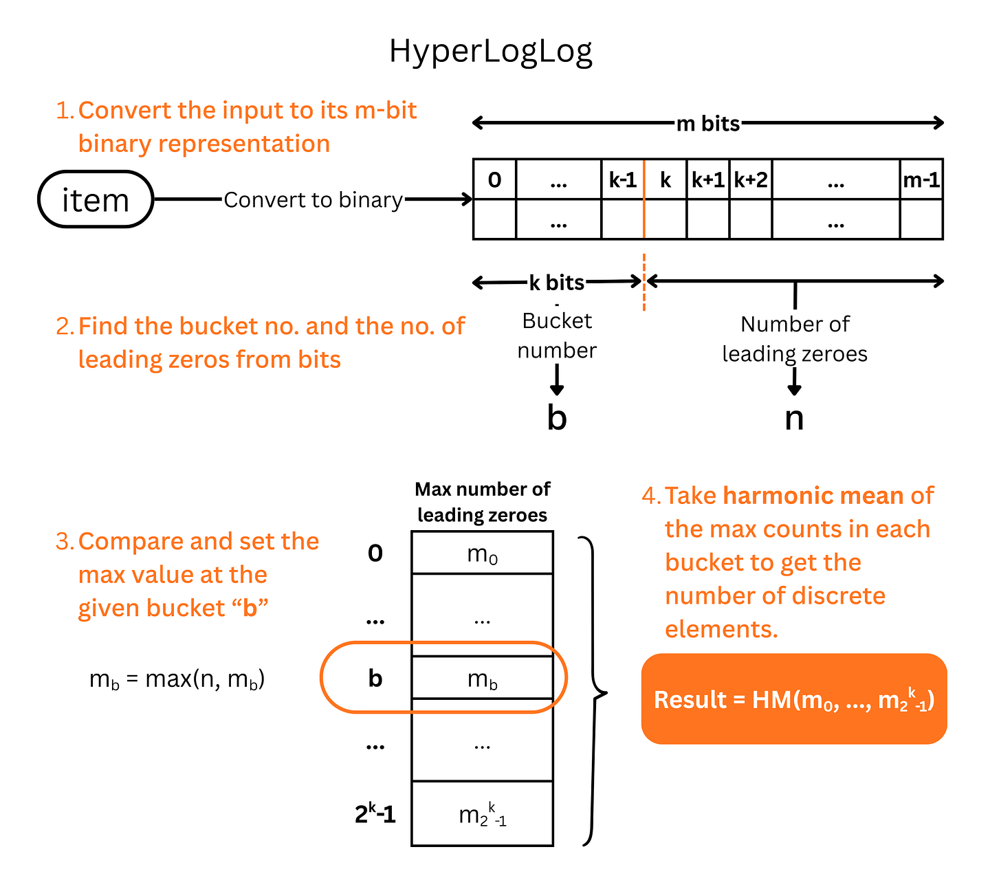 If you have 1 billion events, storing all unique IDs to count them is a nightmare. HyperLogLog solves this by looking at the randomness of data.