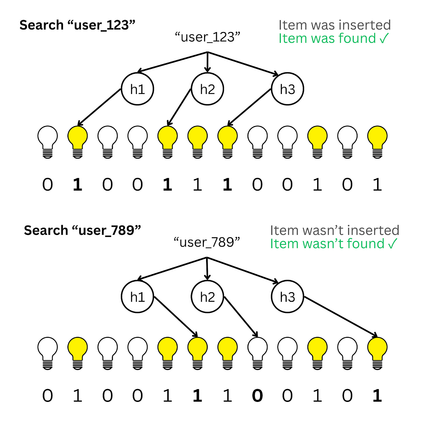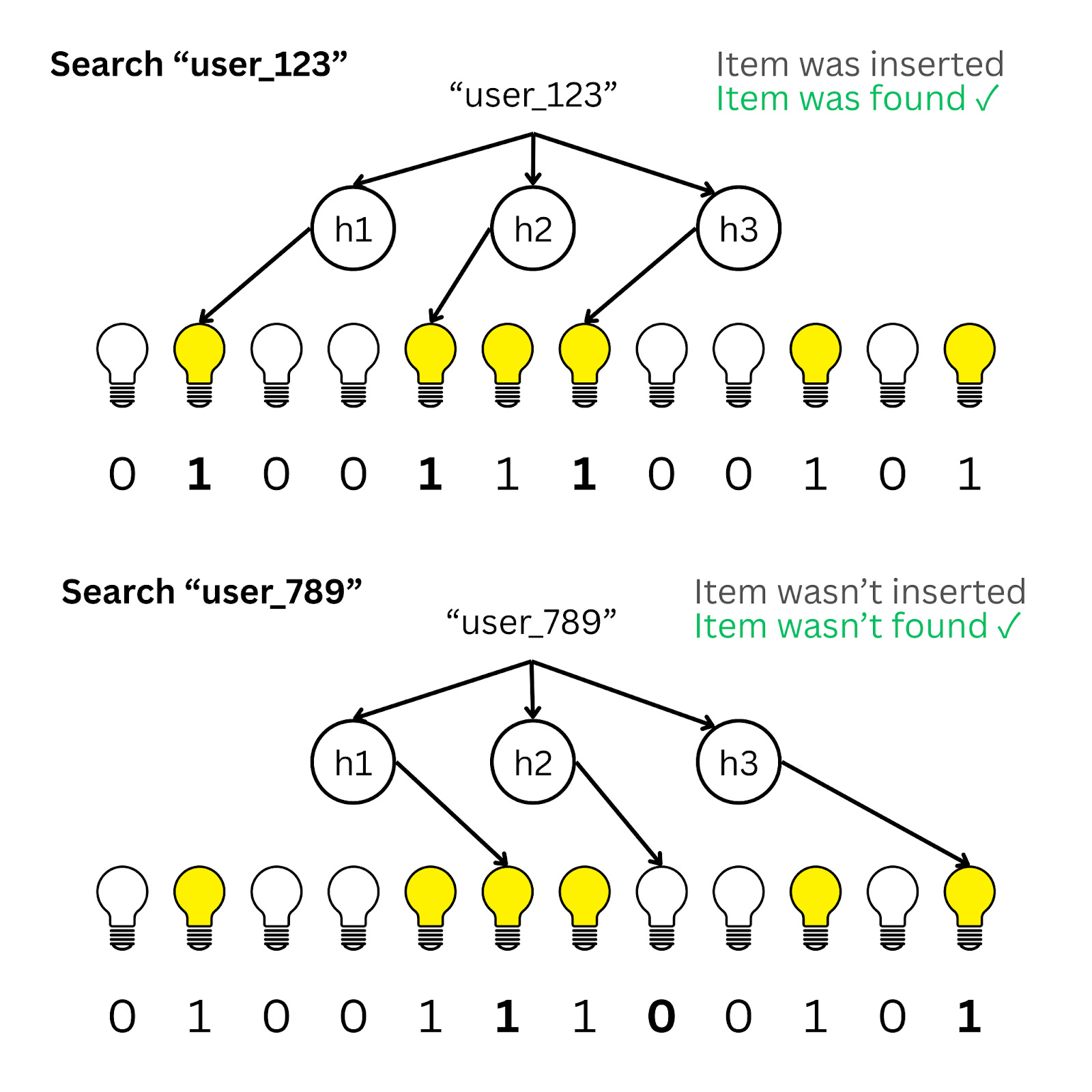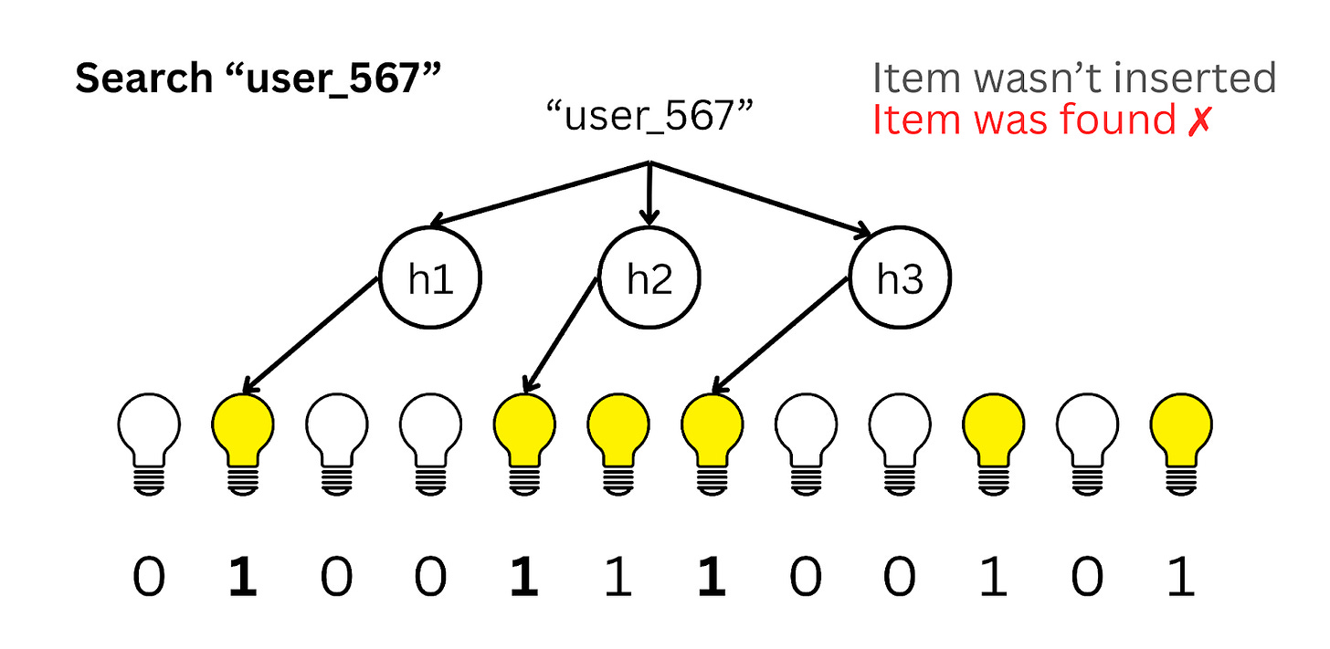 To check if an item exists, you hash it again. If all the corresponding switches are on, the item is probably there. If even one switch is off, the item is definitely not there.